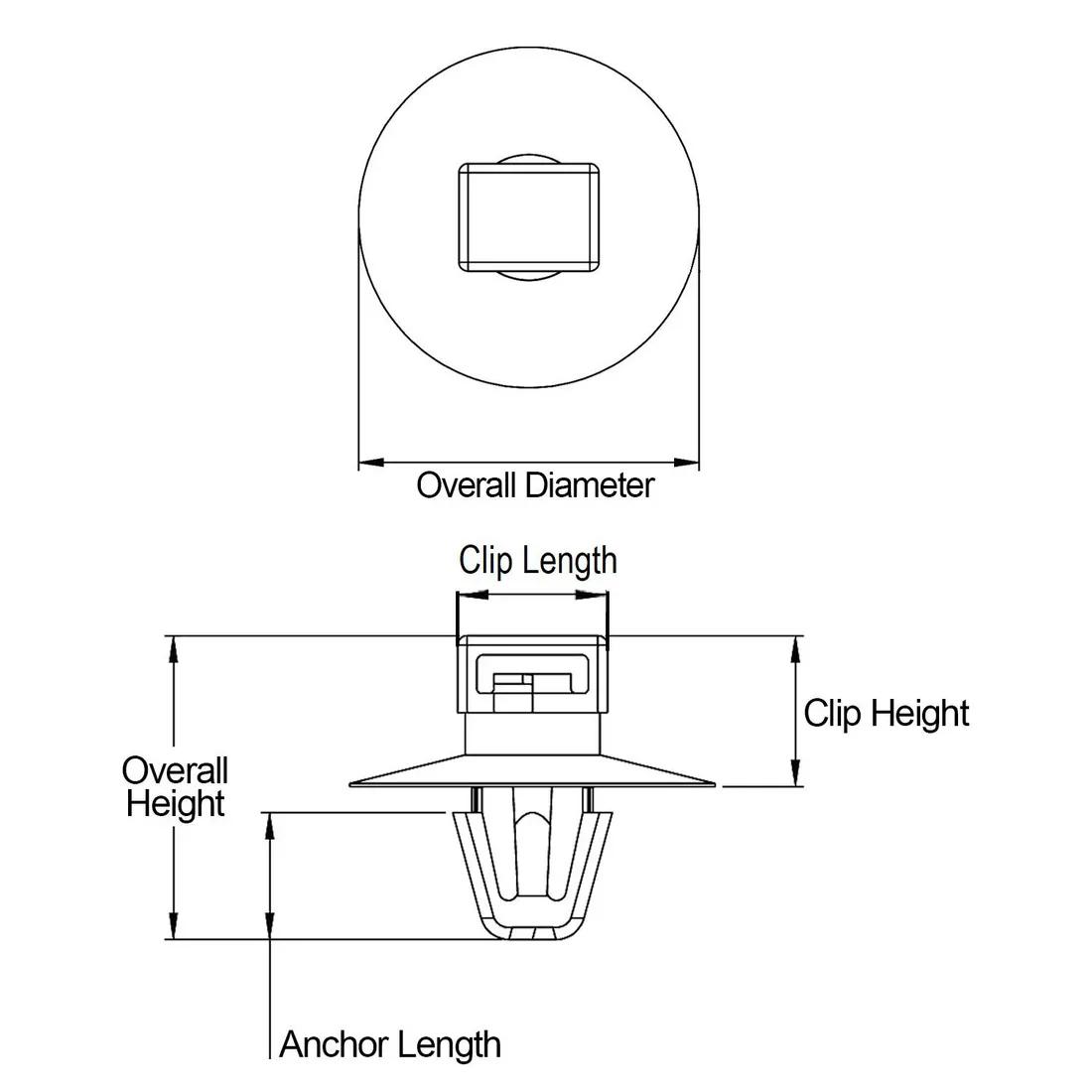 Item Code | Material Flammability Standard | Colour | Anchor Length | Maximum Panel Thickness | Mounting Hole Diameter | Material | Overall Diameter | Overall Height | Clip Height | Clip Width | Type | Request Quote |