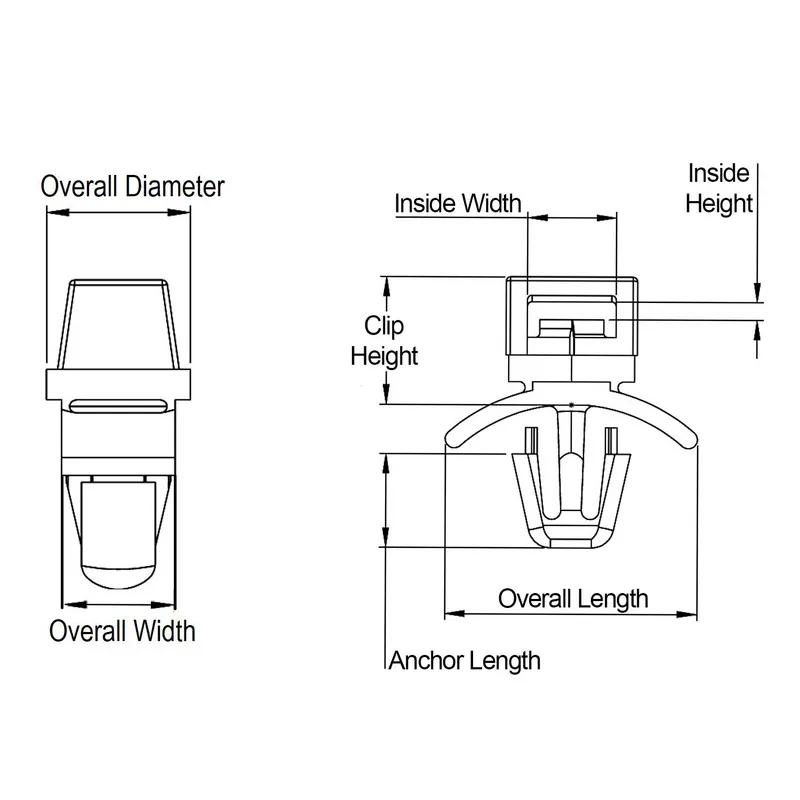 Item Code | Colour | Inside Height | Overall Width | Maximum Panel Thickness | Mounting Hole Diameter | Maximum Operating Temperature | Clip Width | Inside Width | Material Flammability Standard | Minimum Operating Temperature | Material | Overall Diameter | Overall Length | Anchor Length | Minimum Panel Thickness | Cable Width | Clip Height | Request Quote |