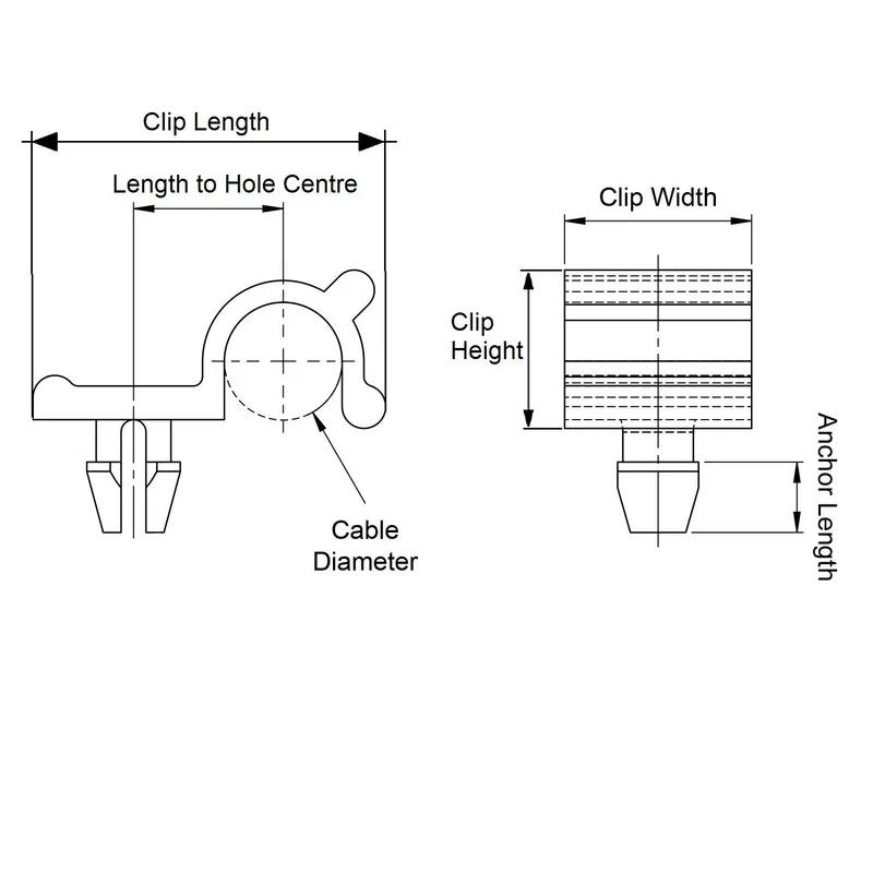 Item Code | Đường kính tối đa của chân neo | Màu sắc | Độ dài Clip | Độ dài đến tâm lỗ | Đường kính cáp | Độ dày panel | Chất liệu kẹp | Kích thước lỗ gắn tối đa | Màu sắc | Đường kính bên trong tối thiểu | Chất liệu | Chiều dài tổng thể | Chiều dài neo | Yêu cầu báo giá |