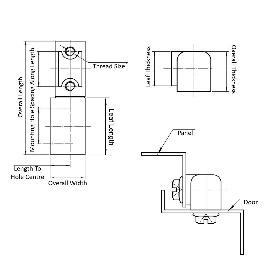 Cho phép loại bỏ cửa đơn giản và nhanh chóng. Đi kèm với máy giặt bằng nylon. Cố định bằng cách sử dụng ốc vít M5 (không được cung cấp). Có thể sử dụng như tay trái hoặc tay phải. Góc xoay bản lề 180.