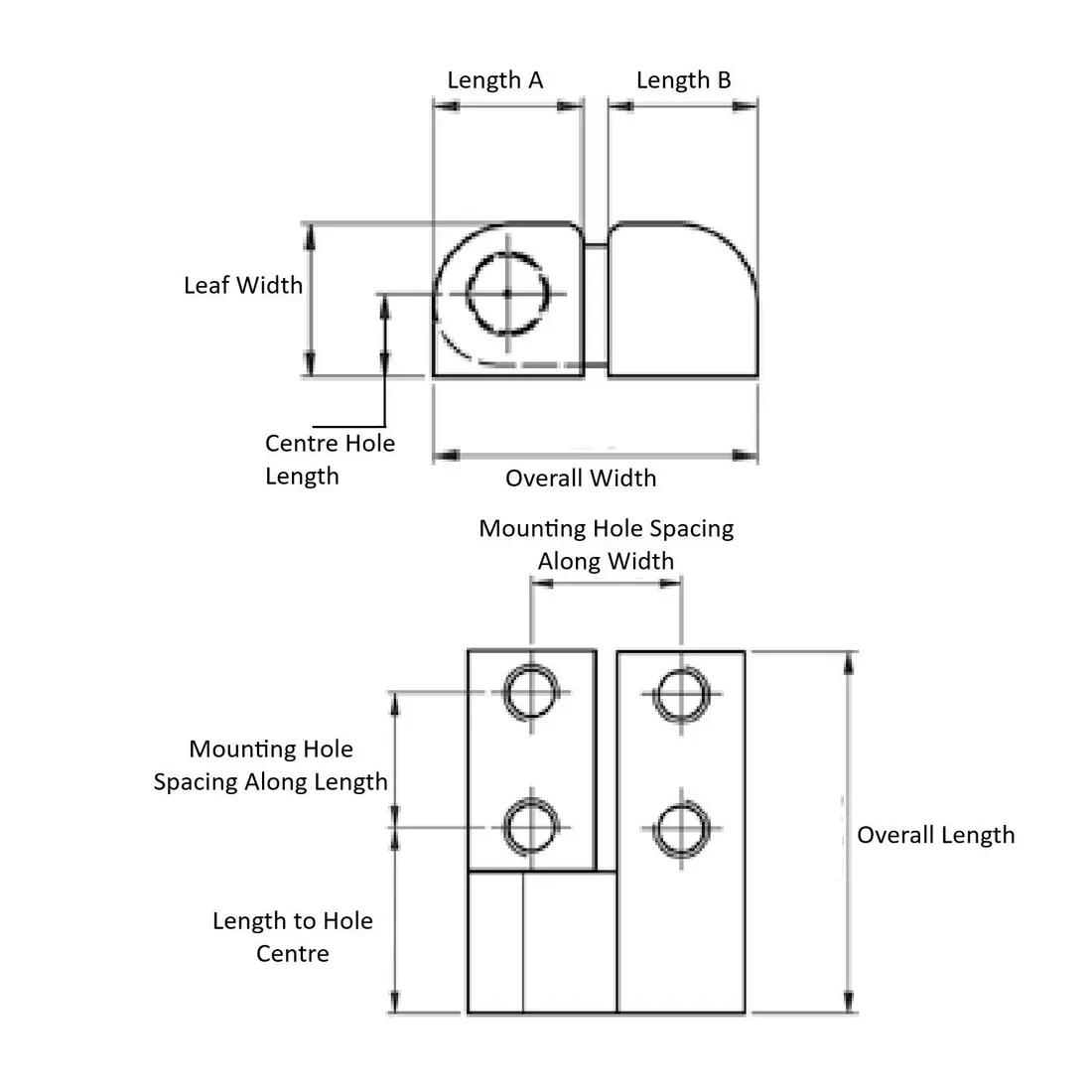 Item Code | Màu sắc | Orientation | Chiều rộng tổng thể | Chiều dài tổng thể | Độ dài đến tâm lỗ | Centre Hole Length | Leaf Width | Length A | Chiều dài lỗ gắn | Mounting Orientation | Chiều cao lỗ gắn | Kích thước ren | Chất liệu | Maximum Rotation | Length B | Yêu cầu báo giá |
