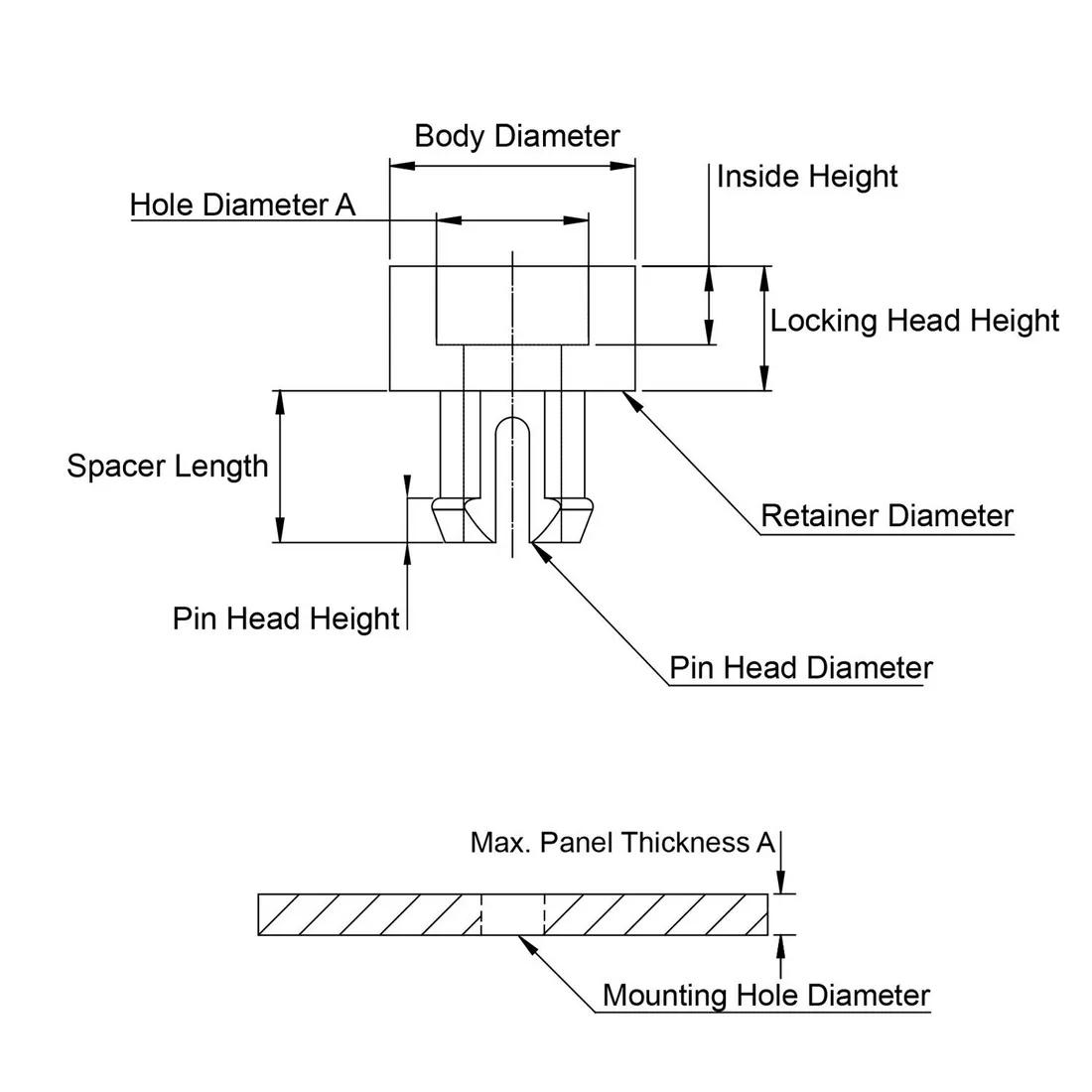 Item Code | Đường kính tối đa của chân neo | Loại cố định Lỗ A | Màu sắc | Đường kính thân | Chiều dài khoảng cách lỗ | Chiều dài khoảng cách | Mô tả UL/CSA | Loại cố định Lỗ B | Kích thước lỗ gắn | Chiều dài đầu khóa | Loại | Đường kính của bộ giữ | Đường kính bên trong tối thiểu | Kích thước ren | Chất liệu | Đường kính ngoài tối đa | Kích thước lỗ gắn tối đa | Đường kính đầu chân cắm | Chiều dài ren bên trong A | Chiều cao đầu chốt | Yêu cầu báo giá |