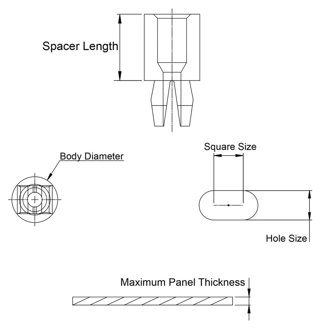 Item Code | Đường kính tối đa của chân neo | Màu sắc | Đường kính thân | Chiều dài khoảng cách | Mô tả UL/CSA | Độ dày panel tối đa | Kích thước vuông | Kích thước lỗ gắn tối đa | Đường kính bên trong tối thiểu | Kích thước ren | Chất liệu | Hình dạng đầu | Đường kính bên trong | Yêu cầu báo giá |