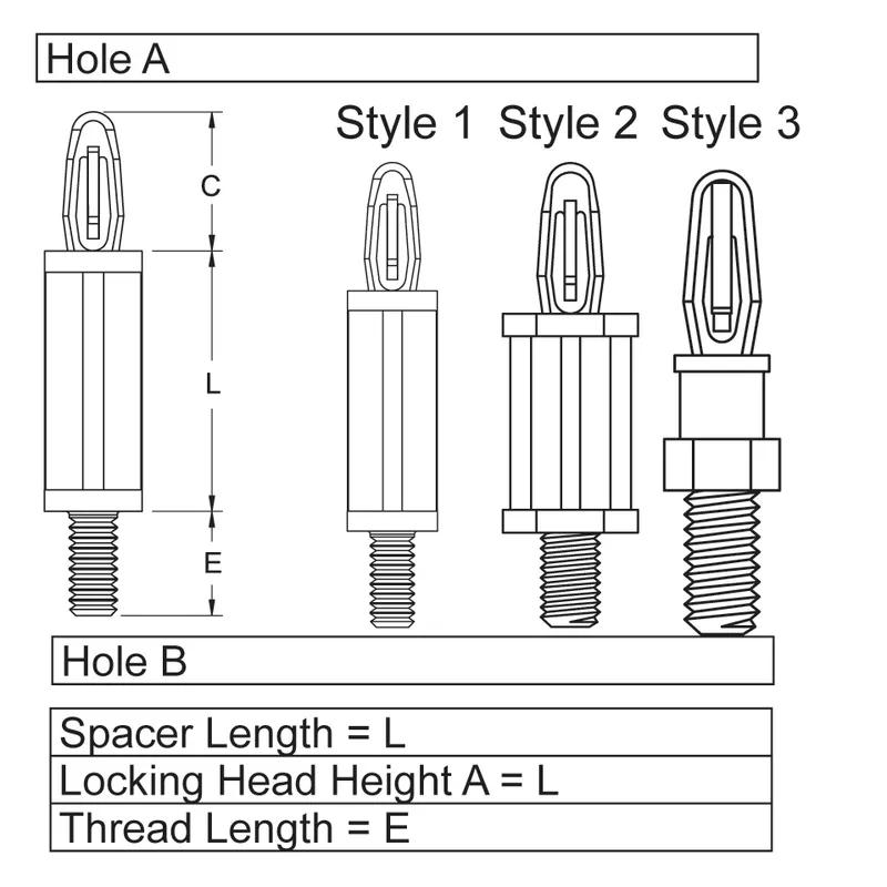 Item Code | Kích thước lỗ gắn tối thiểu | Đường kính tối đa của chân neo | Loại cố định Lỗ A | Màu sắc | Đường kính thân | Chiều dài khoảng cách lỗ | Chiều dài khoảng cách | Mô tả UL/CSA | Loại cố định Lỗ B | Chiều dài ren | Chiều dài đầu khóa | Đường kính bên trong tối thiểu | Kích thước ren | Chất liệu | Đường kính ngoài tối đa | Kích thước lỗ gắn tối đa | Yêu cầu báo giá |