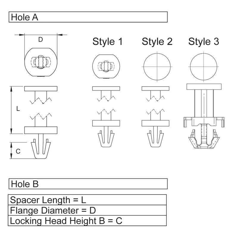 Item Code | Màu sắc | Chiều dài khoảng cách | Mô tả UL/CSA | Kích thước lỗ gắn tối đa | Đường kính tối đa của chân neo | Độ dày giữ tối thiểu | Đường kính lỗ tối đa A | Đường kính thân | Đường kính bên trong tối thiểu | Chất liệu | Độ dày panel tối đa | Chiều rộng của mặt bích | Loại cố định Lỗ B | Loại | Khả năng chịu tải | Yêu cầu báo giá |