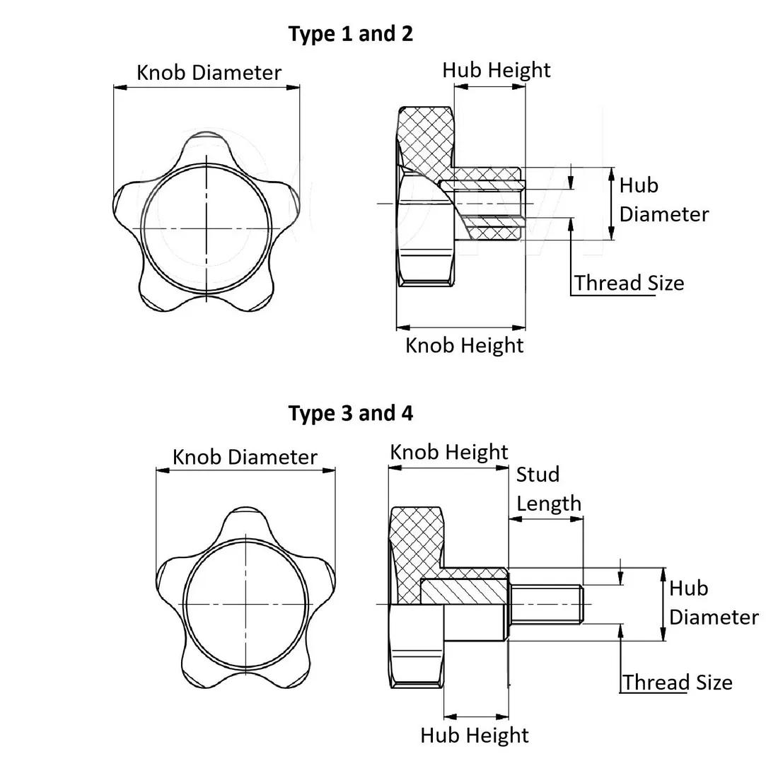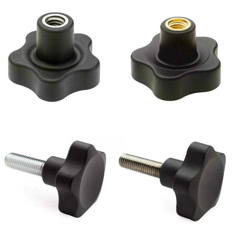 Chịu được dung môi, dầu và mỡ. Tay cầm năm lá cung cấp độ bám tuyệt vời. Màu đen, mờ nhạt. Loại 1: Núm đai ốc bằng đồng thau. Loại 2: Núm lỗ mù với sợi đầu bằng thép không gỉ AISI 303. Loại 3: Núm đinh tán bằng thép mạ kẽm. Loại 4: với núm đinh tán bằng thép không gỉ AISI 303.